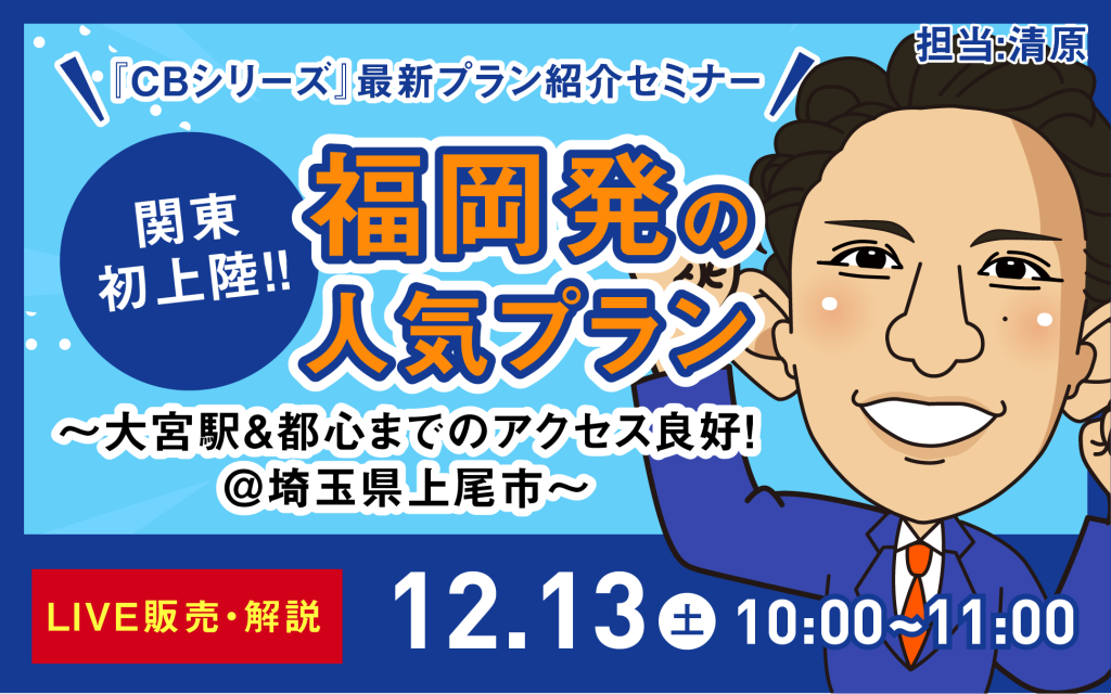 TOP > NEWS > 『CBシリーズ』最新プラン&新築物件ご紹介セミナー開催のお知らせ『CBシリーズ』最新プラン&新築物件ご紹介セミナー開催のお知らせ掲載日:2025/12/01オリジナル企画アパート「CBシリーズ」において、福岡エリアで好評を得ている最新プランの関東初上陸を記念し、2025年12月13日(土)にオンラインセミナー「『CBシリーズ』最新プラン&新築物件ご紹介セミナー」を開催いたします。今回のセミナーでは、福岡で展開してきたプランの魅力を詳しく紹介するとともに、実際に販売中の関東エリア物件の詳細も LIVEでお届けします。CBシリーズのご購入を検討されているまたはご興味のある方はもちろん、CBシリーズを既にご所有いただいている方も、ぜひご参加ください!!■セミナー概要 【開催日時】2025年12月13日(土) 10:00~11:00【参加方法】オンライン視聴(Zoom・事前申込制)【参加特典】不動産投資関連書籍 ※ご視聴・アンケート回答いただいた方の中から抽選で10名様にプレゼント