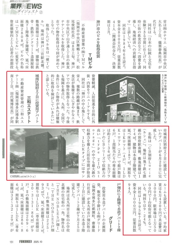 TOP > NEWS > ふくおか経済10月号に掲載されましたふくおか経済10月号に掲載されました掲載日:2025/10/17ふくおか経済10月号に、城南区別府2丁目に竣工した「CB別府ルシエ」の記事が掲載されています。