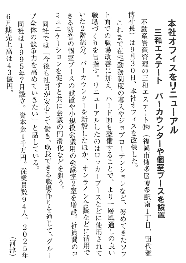 TOP > NEWS > ふくおか経済の速報誌「週刊経済」に掲載されましたふくおか経済の速報誌「週刊経済」に掲載されました掲載日:2025/12/0511月12日発刊のふくおか経済の速報誌「週刊経済」に、本社オフィスのリニューアル内容をご紹介いただきました。